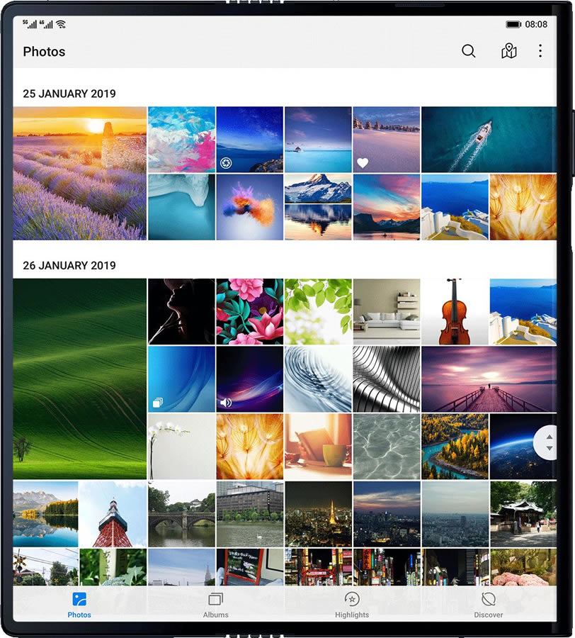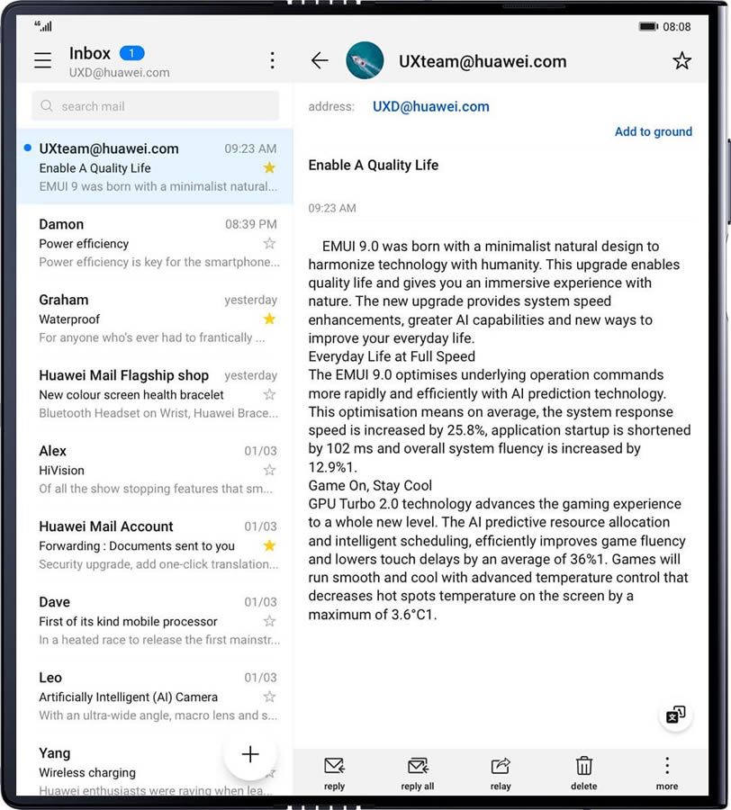 Huawei Mate X ได้รับการเปิดตัวที่งาน Mobile World Congress 2019 ในเมืองบาร์เซโลนา ประเทศสเปน มากับดีไซน์บางกว่าคู่แข่ง ใช้จอแสดงผล OLED ขนาด 6.6 นิ้ว เมื่อถูกพับ และขนาดใหญ่ 8 นิ้ว เมื่อกางออกมาในรูปแบบแท็บเล็ต ขณะที่ Galaxy Fold มีขนาด 7.3 นิ้ว
