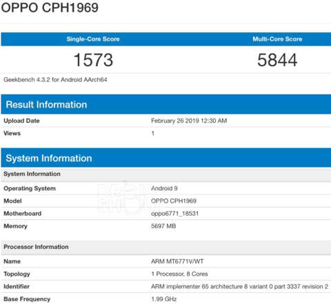 OPPO F11 Pro ถูกทดสอบแล้วบนแอพ Geekbench ยืนยันใช้ชิป Helio P70 RAM 6GB รันบน Android Pie สวมทับด้วย ColorOS 6.0