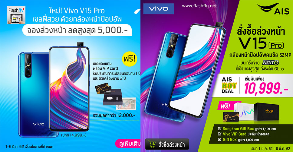 Vivo V15 Pro ราคาพิเศษจาก AIS สำหรับลูกค้าที่ใช้บริการ AIS มาแล้ว 1 เดือนขึ้นไป และจะต้องซื้อพร้อมสมัครแพ็กเกจรายเดือน 4G Hot Deal Max Speed และชำระค่าบริการล่วงหน้า ตามเงื่อนไขที่บริษัทฯ กำหนด