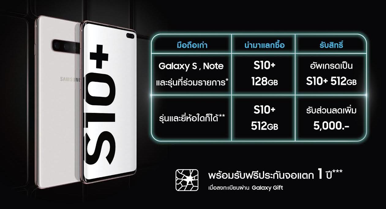 เพื่อเป็นการตอบรับความสำเร็จดังกล่าว ซัมซุงได้ส่งโปรโมชั่นสุดพิเศษมาเอาใจพร้อมคืนกำไรให้แก่ผู้บริโภคแบบจัดเต็ม โดยสำหรับโปรโมชั่น “เก่าแลกใหม่” ลูกค้าสามารถนำ กาแลคซี่ เอส หรือ กาแลคซี่ โน้ต และสมาร์ทโฟนรุ่นอื่นๆ ที่ร่วมรายการเครื่องเก่ามาแลกเป็นส่วนลดซื้อ กาแลคซี่ เอส 10 พลัส รุ่นความจุ 128GB พร้อมรับสิทธิ์อัพเกรดเป็นความจุ 512GB ทันที (มูลค่า 9,000 บาท) ที่ ซัมซุงแบรนด์ช็อปที่ร่วมรายการ ตั้งแต่วันที่ 8 – 31 มีนาคม 2562 หรือตรวจสอบรายละเอียดโปรโมชั่น และตรวจสอบรุ่นที่ร่วมรายการเพิ่มเติมได้ที่ https://www.samsung.com/th/offer/tradein/