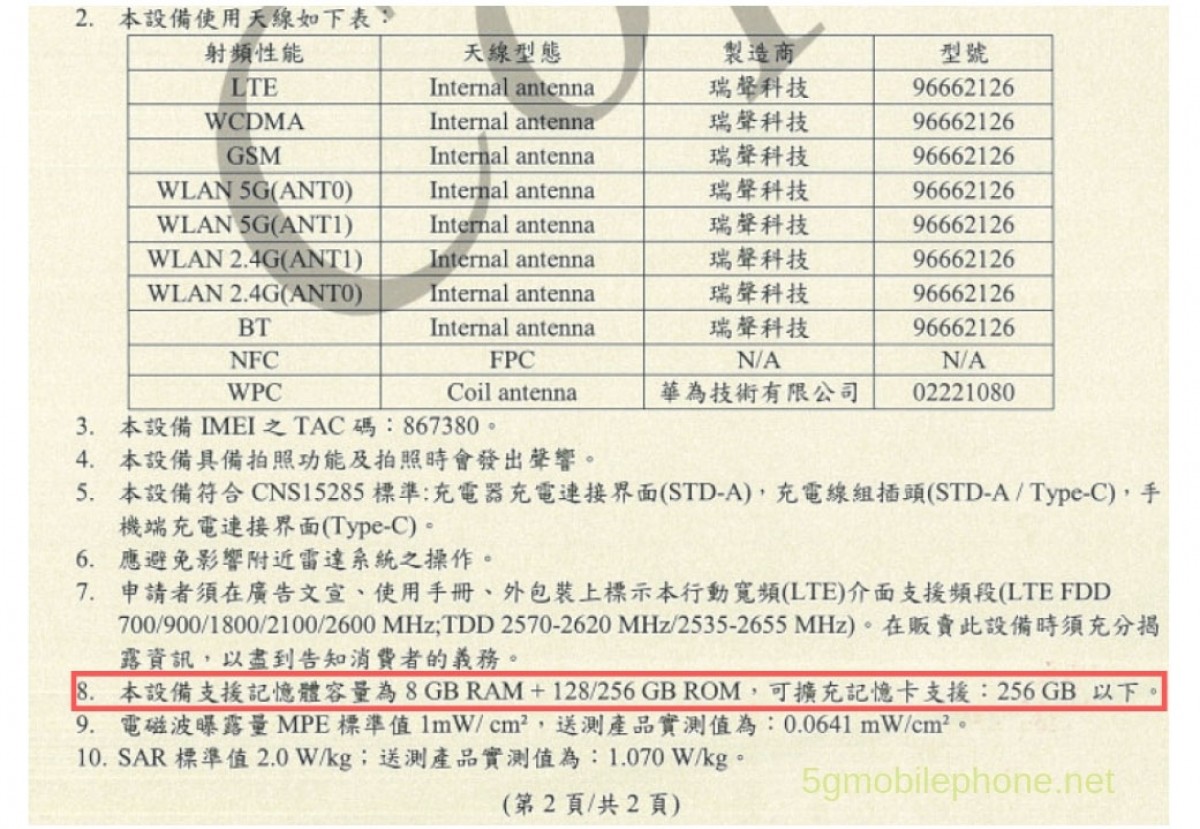 - VOG-L29 (อาจเป็น Huawei P30 Pro) มากับ RAM 8GB จับคู่กับ ROM 128GB หรือ 256GB