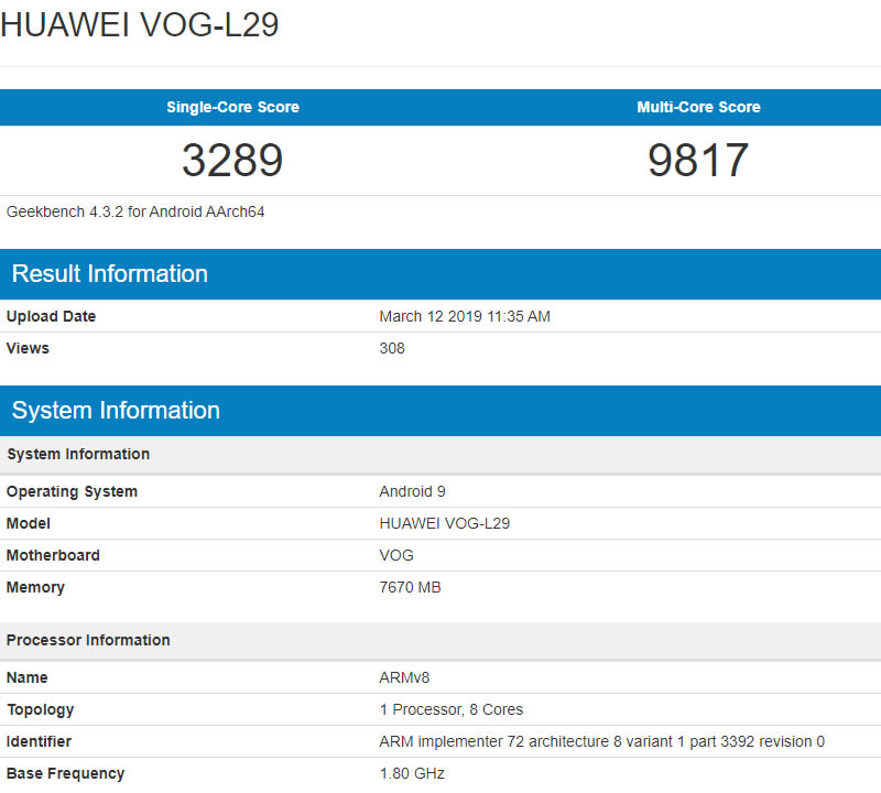พบสมาร์ทโฟนรุ่นใหม่ของ Huawei ได้รับการทดสอบแล้วบนแอพพลิเคชั่น Geekbench โดยใช้รหัสรุ่น VOG-L29 ซึ่งเป็นรหัสรุ่นของ Huawei P30 Pro ได้รับ 3,289 คะแนน สำหรับ Single-Core และ 9,817 คะแนน สำหรับ Multi-Core
