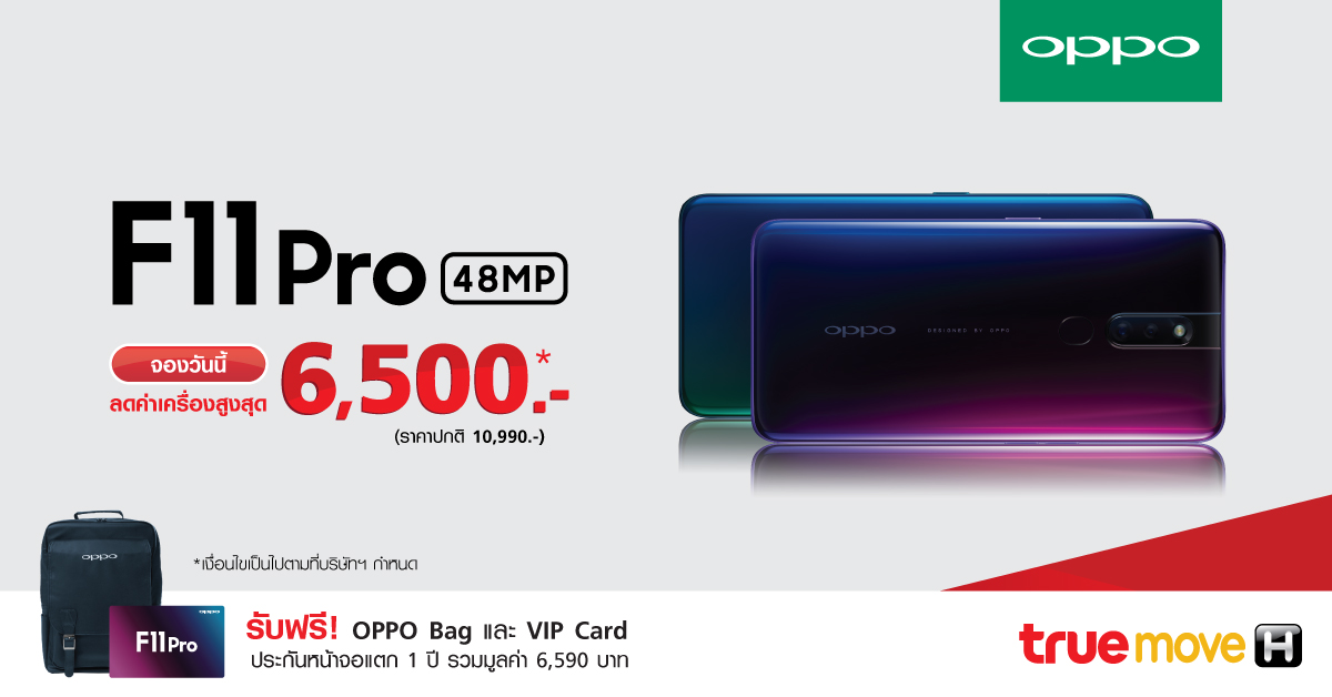 และข้อเสนอสุดพิเศษจากทรูมูฟ เอช เปิดจอง OPPO F11 Pro มอบส่วนลดค่าเครื่องทันที 6,500 บาท จ่ายเพียง 4,490 บาท (ราคาปกติ 10,990 บาท) และรับส่วนลดค่าบริการเดือนละ 400 บาท นาน 10 เดือน เมื่อสมัครแพ็กเกจรายเดือน OPPO Max Speed 1099 ขึ้นไป และชำระค่าบริการล่วงหน้า 4,000 บาท รับฟรี! เน็ต 4G ไม่อั้นเต็มสปีด พร้อมโทรฟรีทุกเครือข่าย 400นาที และรับสิทธิดูฟรี True ID คมชัดแบบ HD เต็มอิ่มทุกความบันเทิงนาน 12 เดือน พิเศษ! รับฟรีของที่ระลึกสุดเอ็กซ์คลูซีฟ กระเป๋า OPPO และบัตรวีไอพี รับประกันหน้าจอแตก นาน 1 ปี รวมมูลค่า 6,590 บาท พร้อมรับสิทธิผ่อนสูงสุดนาน 15เดือน ลูกค้าที่สนใจสามารถจองได้ตั้งแต่วันที่ 16 – 27 มีนาคมนี้ และรับเครื่องได้ตั้งแต่ 28 มีนาคม – 8 เมษายน 2562