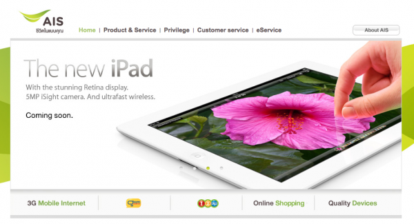 หลังจากที่ทาง dtac ได้ประกาศเปิดจอง New iPad เป็นรายแรกแล้วล่าสุดทาง AIS ก็ขึ้นป้าน Banner โฆษณา New iPad แล้วที่เว็บไซต์ของ AIS www.ais.co.th/ipad คาดว่าน่าจะเปิดจองในช่วงวันเวลาเดียวกับทาง dtac แต่จะแตกต่างกันที่โปรโมชั่น