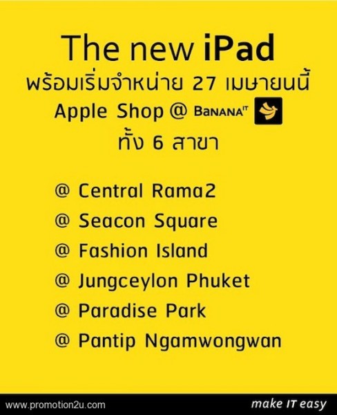 นายสุระ คณิตทวีกุล ประธานเจ้าหน้าที่บริหาร บานาน่า ไอทีเผยว่า “จากการที่ Apple ได้ทำการเปิดตัว The New iPad ไปเมื่อเดือนมีนาคมที่ผ่านมา จนทำให้เกิดกระแสความต้องการ The new iPad ไปทั่วโลก รวมถึงมีผู้ที่สนใจติดตามข่าวสารการวางจำหน่ายในประเทศของตนเองเป็นอย่างมาก และถือว่าเป็นข่าวดีสำหรับสาวกชาวไทยที่รอคอยการวางจำหน่าย The New iPad เพราะล่าสุด บานาน่า ไอที ได้ยืนยันกำหนดการในการเปิดจำหน่าย The New iPad อย่างเป็นทางการแล้ว ในวันที่ 27 เมษายน 2555 นี้ ซึ่งจะเปิดจำหน่ายใน 6 สาขา ที่เป็น Land Mark ก่อน ได้แก่