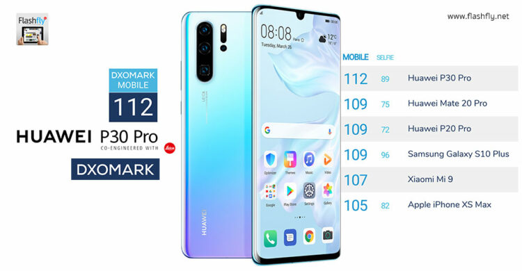 Huawei P30 Pro มากับกล้องหลัง 3 ตัว กล้องหลัก 40 ล้านพิกเซล รูรับแสง F1.6 มีระบบลดภาพสั่นไหว OIS มาพร้อมกล้องเทเลโฟโต้ 8 ล้านพิกเซล มีระบบลดภาพสั่นไหว OIS เช่นกัน และยังมีกล้องมุมกว้าง 20 ล้านพิกเซล สามารถทำคะแนนจาก DxOMark ได้สูงถึง 112 คะแนน ขึ้นไปอยู่อันดับบนสุดของตาราง แซงหน้า P20 Pro และ Mate 20 Pro รวมถึง Samsung Galaxy S10 Plus ที่ทำได้ 109 คะแนนเท่ากัน