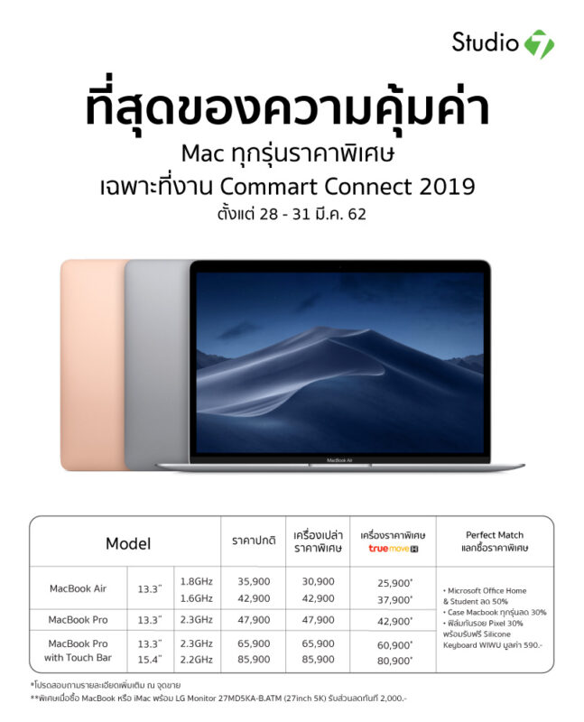 ใครอยากได้สินค้า Apple ราคาพิเศษมาได้ที่งาน Commart Connect 2019 ที่บูธ Studio 7 ไบเทค บางนา สินค้าใหม่ทุกชิ้นลดยกบูธ ลดสูงสุด 80%* พร้อมให้คุณผ่อน 0% นาน 24 เดือน กับธนาคารที่ร่วมรายการ และรับเครดิตเงินสูงสุด 35,000 บาท* ตั้งแต่วันที่ 28 – 31 มี.ค 62