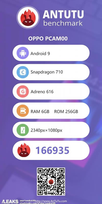 แหล่งข่าวอ้างว่า OPPO PCAM00 ที่ได้รับการทดสอบบนแอพพลิเคชั่น AnTuTu เป็นรุ่นเดียวกับ Reno เวอร์ชั่นประหยัด โดยมากับระบบปฏิบัติการ Android 9 Pie ใช้ชิปประมวลผล Qualcomm Snapdragon 710 ความจำ RAM 6GB จับคู่กับ ROM 256GB จอแสดงผล 2340 x 1080 พิกเซล และทำได้ 166,935 คะแนน