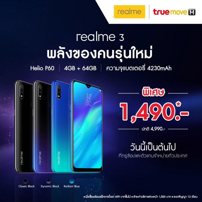 ล่าสุดทาง realme แบรนด์สมาร์ทโฟนเพื่อคนรุ่นใหม่ได้ปรับลดราคา realme 3 ความจุ 4+64 GB เหลือเพียง 4,990 บาท (จากราคาปกติ 5,990 บาท) ตั้งแต่ 27 กรกฎาคม 2562 เป็นต้นไป มีให้เลือก 2 สี ได้แก่ Dynamic Black และ Radiant Blue วางจำหน่ายที่ Banana, BKK Tablet Smartphone, CYBORG KONG, KINGKONG PHONE, TEAM Tablet Smartphone, MAXLINK, IBIZ, CSC และตัวแทนจำหน่ายทั่วประเทศ