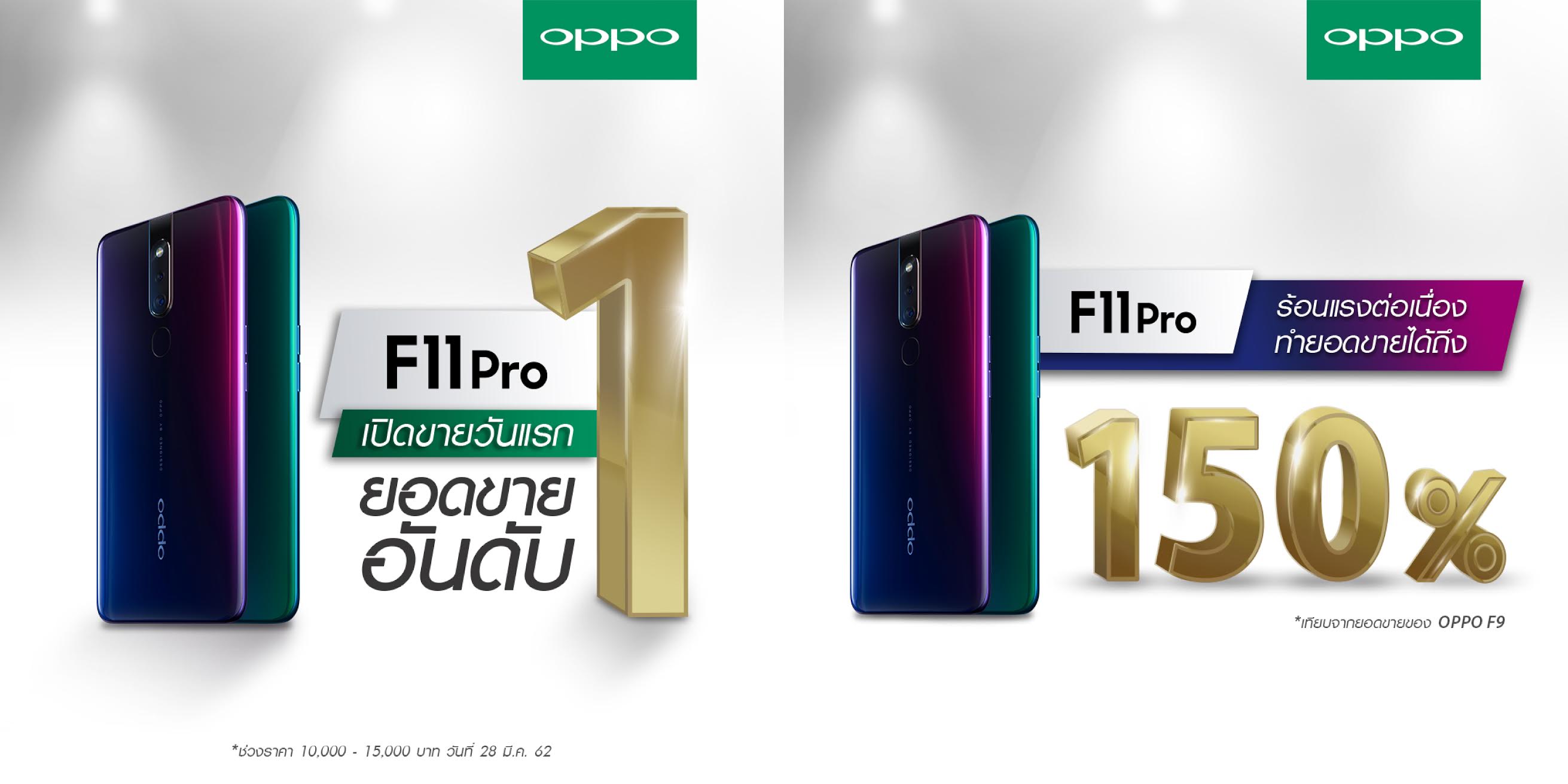 ซึ่ง OPPO F11 Pro ได้รับเสียงตอบรับดีเกินคาด โดยสามารถทำยอดขายได้ถึง 150% ของ OPPO F9 และยังเป็นสมาร์ทโฟนที่ขายดีเป็นอันดับ 1 ต่อเนื่อง 3 วันในตลาดสมาร์ทโฟนที่มีช่วงราคา 10,000 – 15,000 บาท โดยนับตั้งแต่วันแรกที่เปิดขาย คือ 28 มีนาคม 2562 ที่ผ่านมา