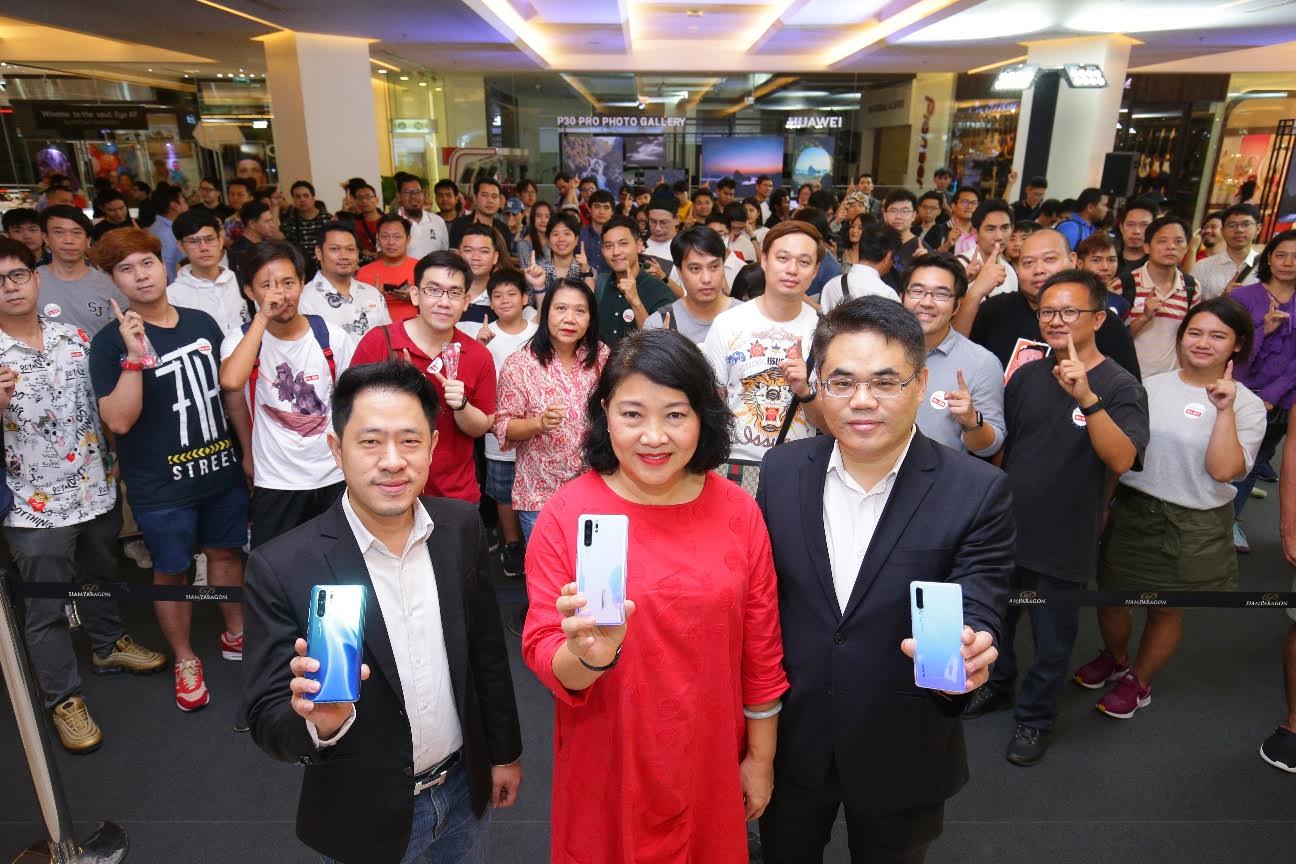 อิงมาร์ หวาง ผู้อำนวยการ หัวเว่ย คอนซูมเมอร์ บิสสิเนส กรุ๊ป ประเทศไทย (ขวา), นราธิป วิรุฬห์ชาตะพันธ์ผู้อำนวยการสายงานการตลาด บริษัท เจมาร์ท จำกัด(มหาชน) (ซ้าย), และ นราทิพย์ รัตตประดิษฐ์ รองกรรมการผู้จัดการใหญ่อาวุโส สายงานปฏิบัติการ บริษัท สยามพารากอน ดีเวลลอปเม้นท์ จำกัด (กลาง),ต้อนรับกองทัพ แฟนหัวเว่ยหลายร้อยคนคนที่มาเข้าคิวซื้อเครื่อง HUAWEI P30 Series – Super Camera Smartphone ที่ฮ็อตฮิตที่สุดในเวลานี้เป็นรอบพิเศษในเมืองไทย ณ Huawei Experience Store สยามพารากอน