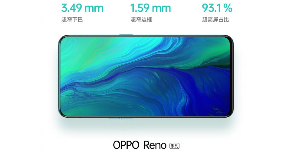เบื้องหลังที่ทำให้ OPPO Reno มีอัตราส่วนหน้าจอต่อบอดี้สูงถึง 93.1% อยู่ที่ขอบจอ โดยมีพื้นที่ขอบจอด้านข้างบางเพียง 1.59 มิลลิเมตร ส่วนขอบจอด้านล่างหรือคาง มีความบาง 3.49 มิลลิเมตร ขณะที่ OPPO Find X มีขอบจอด้านล่าง 3.4 มิลลิเมตร
