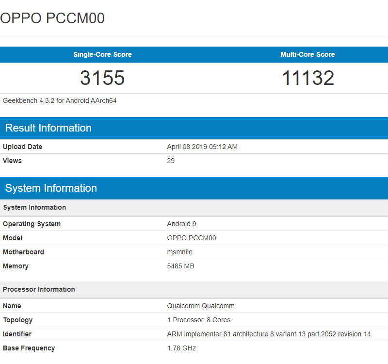 ข้อมูลจาก Geekbench ยังช่วยยืนยันว่า OPPO Reno 10X Zoom จะมาพร้อมระบบปฏิบัติการ Android 9 Pie ใช้ชิปประมวลผล Qualcomm Snapdragon 855 และความจำ RAM 6GB