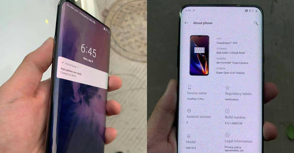 OnePlus 7 Pro ถูกอ้างว่า จะมากับจอแสดงผล Super Optic ขนาด 6.67 นิ้ว ใช้ชิปประมวลผล Qualcomm Snapdragon 855 ความจำ RAM 8GB จับคู่กับ ROM 256GB กล้องหลัง 3 ตัว 48 + 16 + 8 ล้านพิกเซล และทำงานบนพื้นฐาน Android 9 Pie