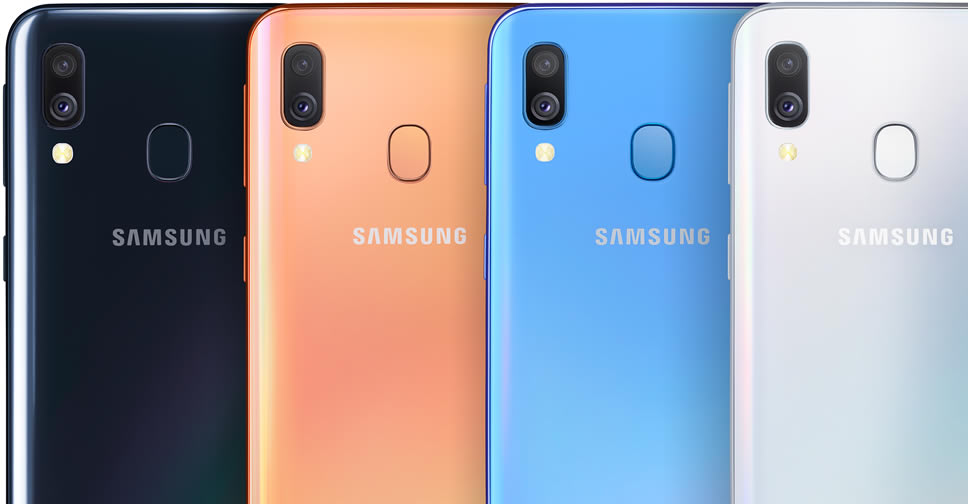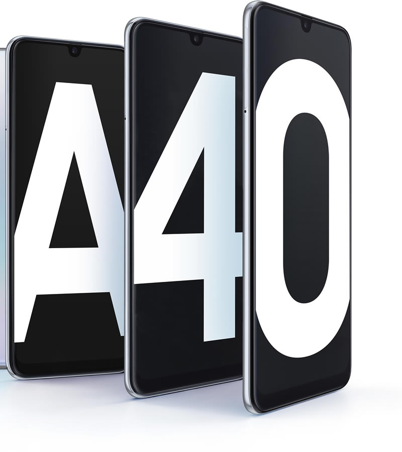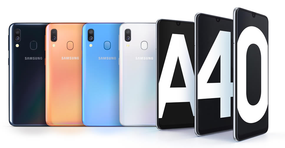 Samsung Galaxy A40 มากับดีไซน์ 3D Glasstic ดูคล้ายกับ Galaxy A30 ใช้จอแสดงผล Infinity-U sAMOLED (1080 x 2220 พิกเซล) ขนาด 5.9 นิ้ว กล้องเซลฟี่ 25 ล้านพิกเซล รูรับแสง F2.0 กล้องคู่หลัง ประกอบด้วยกล้องหลัก 16 ล้านพิกเซล รูรับแสง F1.7 กล้องรอง 5 ล้านพิกเซล รูรับแสง F2.2