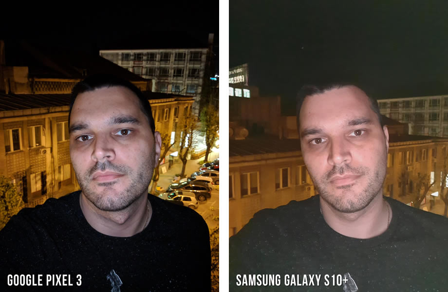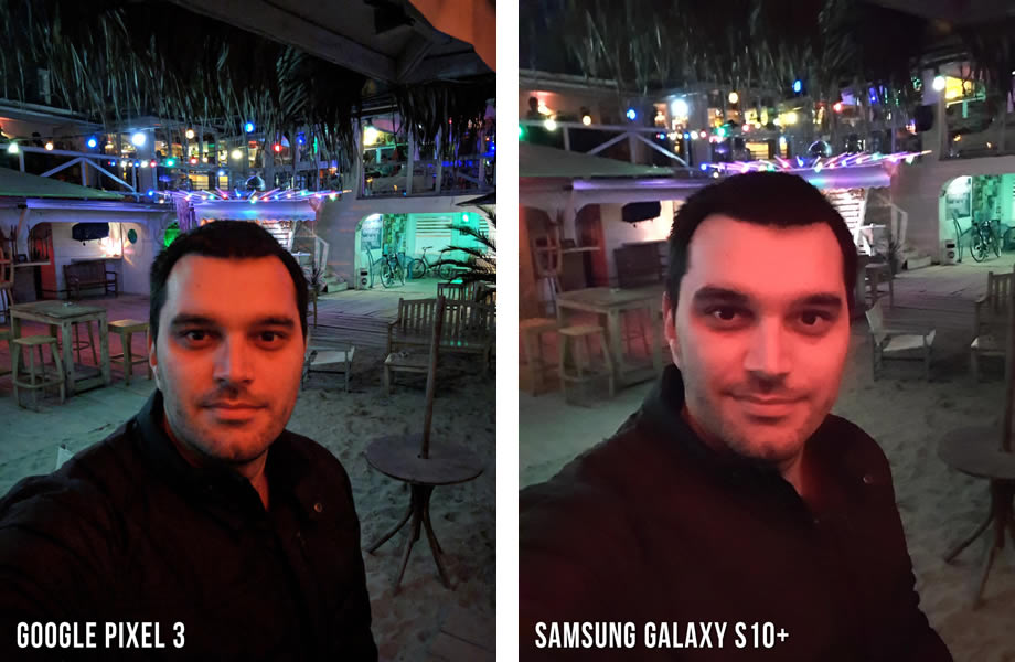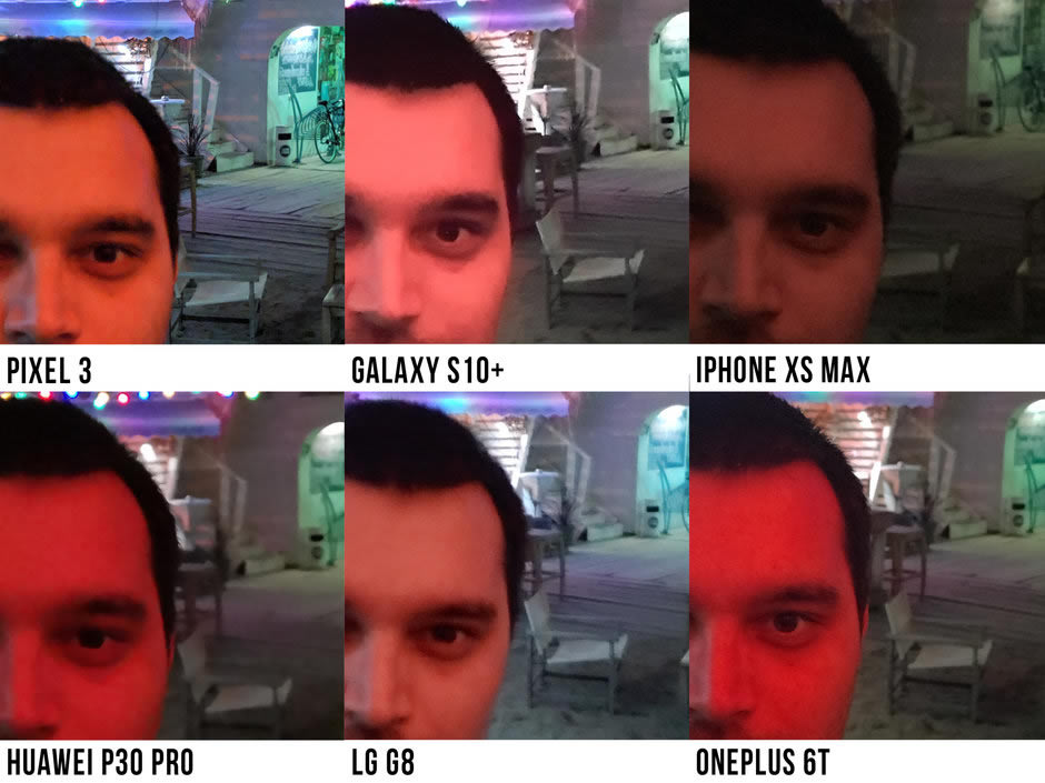 ถ่ายเซลฟี่ในที่แสงน้อยหรือในเวลากลางคืน โดยทีมงานของ Phonearena พยายามใช้แสงจากหลอดไฟสีแดงเข้ามาช่วย และผลปรากฏว่า OnePlus 6T ได้รับคะแนนสูงที่สุดในฉากนี้ ด้วยคะแนน 7.5 เต็ม 10 เฉือน Pixel 3 ที่ได้คะแนน 7 เต็ม 10 ส่วน Galaxy S10+ ที่ทำได้ดีมาตลอดในช่วงตอนกลางวัน ฉากนี้ได้รับคะแนนไป 3.5 เต็ม 10