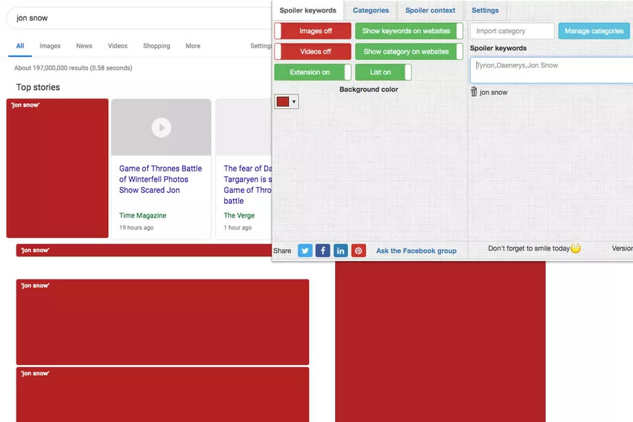 เป็นส่วนขยายที่ทำงานได้ดีกว่า SPOILER PROTECTION 2.0 นอกจากจะปิดกั้นรูปภาพบางส่วน ยังช่วยเซ็นเซอร์พาดหัวที่เกี่ยวข้องกับ Keyword ที่ป้อนไว้ แต่อาจใช้ไม่ได้ผลกับทุกอย่าง โดยเฉพาะการค้นหาข้อมูลบน Google อาจยังเห็นรูปภาพ และ เว็บไซต์ที่ไม่ได้ถูกส่วนขยายรวบรวมไว้