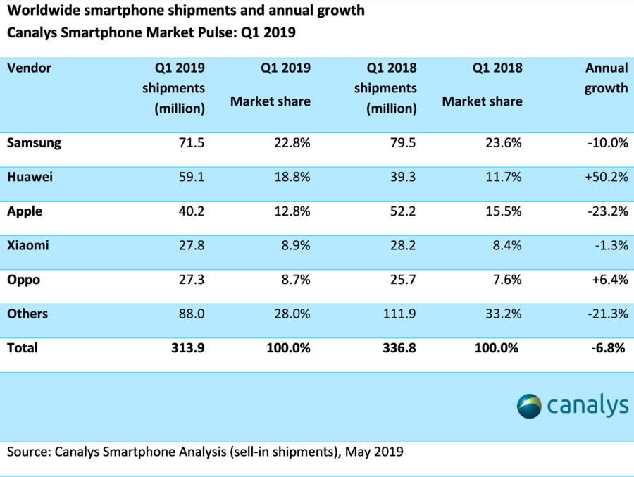 Canalys รายงานยอดจัดส่งสมาร์ทโฟนทั่วโลก ในไตรมาสแรก ของปี 2019 ซึ่งมีตัวเลขแตกต่างจาก IDC เล็กน้อย แต่ข้อมูลจากบริษัทวิจัยตลาดทั้ง 2 แห่ง ก็เป็นไปในทิศทางเดียวกัน ช่วง 3 เดือนแรกของปีนี้ Canalys พบว่ามียอดจัดส่งสมาร์ทโฟนทั่วโลก 313.9 ล้านเครื่อง ลดลง 6.8 % เมื่อเทียบกับไตรมาสเดียวกันของปี 2018 ส่วนข้อมูลของ IDC มียอดจัดส่ง 310.8 ล้านเครื่อง ลดลง 6.6% เมื่อเทียบกับไตรมาสเดียวกันของปี 2018