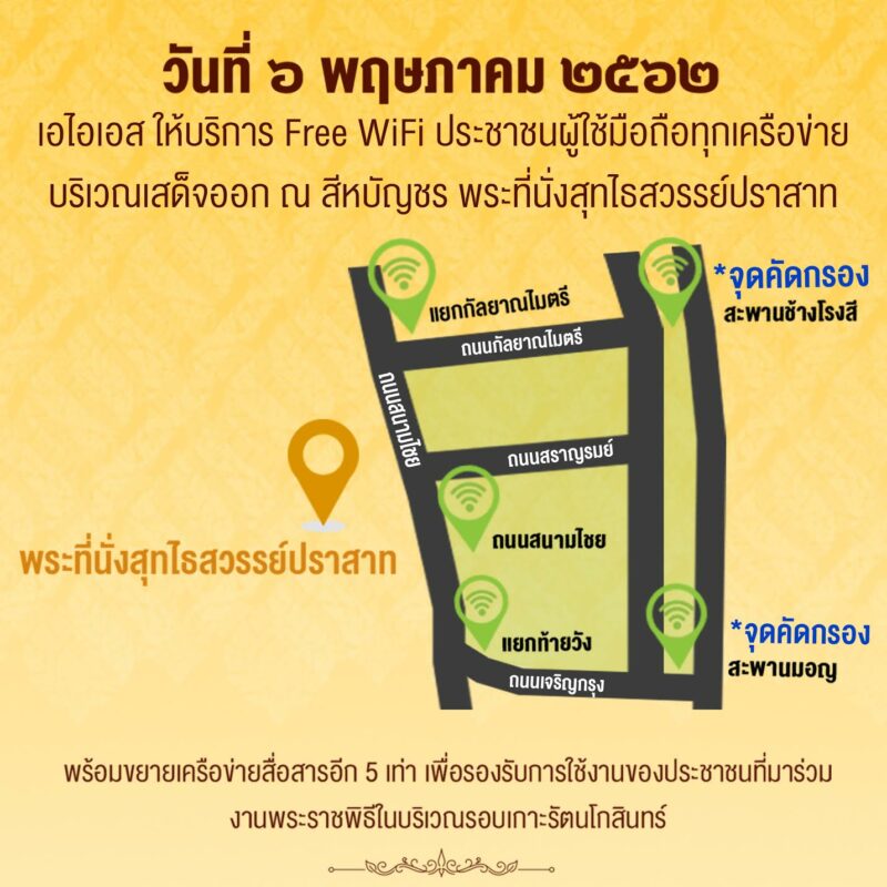 วันที่ 6 พฤษภาคม 2562 : เปิดให้บริการ Free WiFi สำหรับลูกค้าโทรศัพท์มือถือทุกเครือข่ายเพื่อให้ประชาชนและเจ้าหน้าที่สื่อสารได้อย่างไม่ติดขัด โดยสามารถใช้งานได้ง่ายๆ เพียงกดค้นหาสัญญาณ WiFi และเลือกใช้งาน Free WiFi by AIS จากนั้น ลงทะเบียนด้วยหมายเลขประจำตัวประชาชน โดยมีพื้นที่ให้บริการครอบคลุมบริเวณเสด็จออก ณ สีหบัญชร พระที่นั่งสุทไธสวรรย์ปราสาท และบริเวณพื้นที่โดยรอบงานพระราชพิธีบรมราชาภิเษก ครอบคลุมพื้นที่แยกกัลยาณไมตรี ถนนสนามไชย
