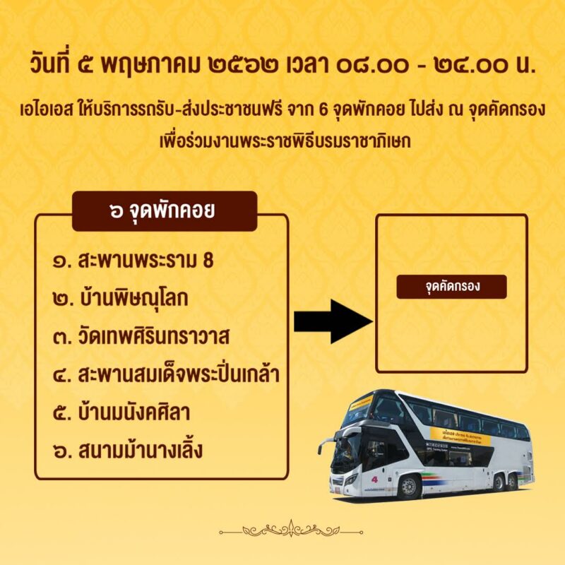 วันที่ 5 พฤษภาคม 2562 : ร่วมกับ กองอำนวยการร่วมพระราชพิธีบรมราชาภิเษก อำนวยความสะดวกแก่ประชาชนที่จะเดินทางมาร่วมถวายพระพรชัยมงคล โดย จัดรถ Shuttle Bus ให้บริการรับ/ส่งฟรี ระหว่างเวลา 08.00-24.00 น. ณ 6 จุดพักคอย ที่กองอำนวยการร่วมฯ กำหนดไว้ ประกอบด้วย สะพานพระรามแปด, สะพานสมเด็จพระปิ่นเกล้า, บ้านพิษณุโลก, บ้านมนังคศิลา, วัดเทพศิรินทร์, สนามม้านางเลิ้ง ไปส่ง ณ จุดคัดกรอง