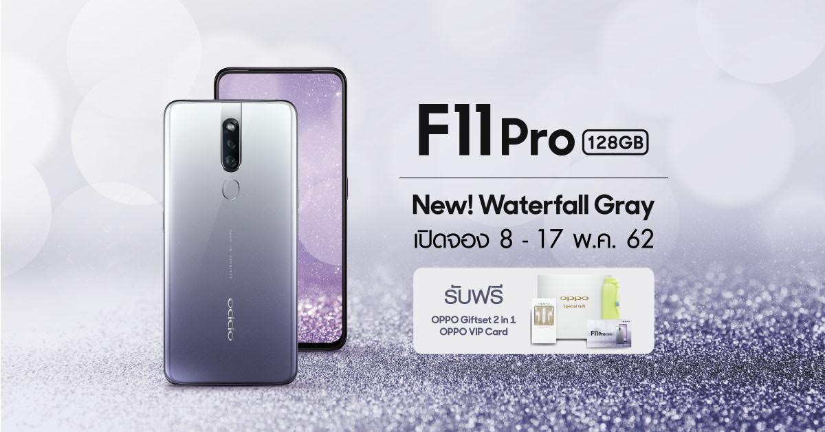 และล่าสุด OPPO ก็ได้เปิดตัวสีใหม่ในซีรีย์ F11 Pro กับสี Waterfall Gray ที่ได้แรงบันดาลใจมาจากความสวยงามของธรรมชาติ ให้ลวดลายไล่เฉดสีขาว-เทาอมม่วง พร้อมประกายระยิบระยับน่าสัมผัส เหมือนสายน้ำของน้ำตก มาพร้อม RAM 6 GB และ ROM ที่เพิ่มขึ้นถึง 128 GB