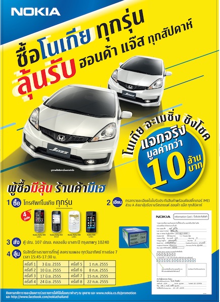 โนเกียแจกโชคให้ผู้ซื้อมีลุ้น ร้านค้ามีเฮ จัด “โนเกีย อะเมซิ่ง ชิงโชค” ให้ลูกค้าที่ซื้อโทรศัพท์มือถือโนเกียทุกรุ่น ตั้งแต่วันที่ 1 พฤษภาคม – 10 กรกฎาคม 2555 ลุ้นรับรถยนต์ฮอนด้า แจ๊ส 1 คันทุกสัปดาห์ พร้อมแจกโชคให้ร้านค้าอีก 1 คัน เป็นเวลา 8 สัปดาห์ รวมทั้งสิ้น 16 คัน รวมมูลค่ากว่า 10 ล้านบาท