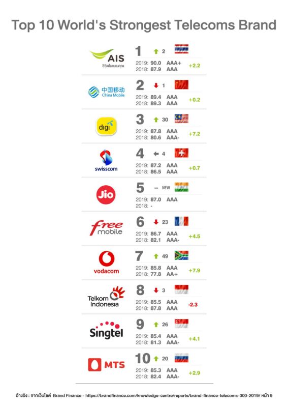– ที่สำคัญคือ สามารถขยายธุรกิจจาก Mobile ไปสู่ Fixed Broadband ซึ่งถือเป็นธุรกิจใหม่และสร้างการเติบโตได้อย่างโดดเด่นในช่วง 2-3 ปีที่ผ่านมา ด้วยปัจจัยดังกล่าว ทำให้ภาพรวมมูลค่าแบรนด์ของ AIS มีความแข็งแกร่งเป็นอันดับ 1 จากการศึกษาข้อมูลเชิงลึกจากบริษัทในกลุ่มโทรคมนาคมทั่วโลก 300 บริษัท เฉือนชนะChina Mobile ซึ่งเคยได้อันดับ 1ในปีที่ผ่านมา