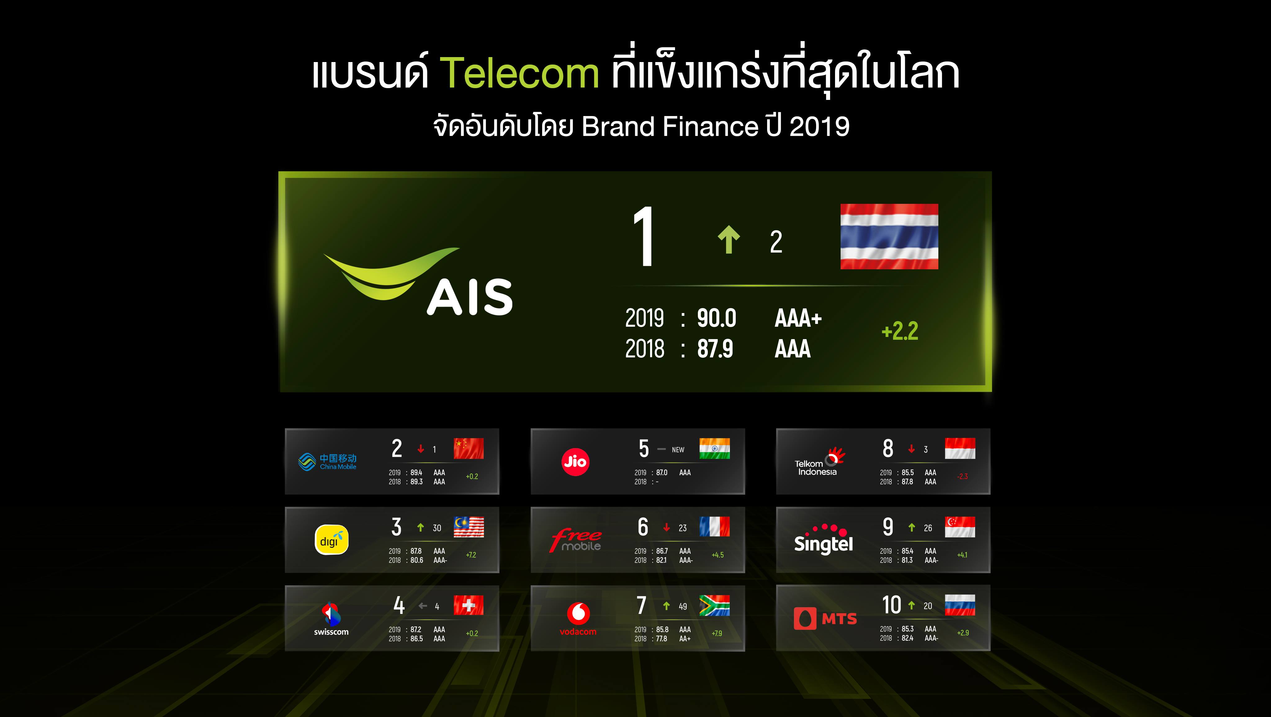 AIS ได้รับการจัดอันดับเป็น “แบรนด์โทรคมนาคมที่แข็งแกร่งที่สุดในโลก อันดับ 1 – World’s Strongest Telecoms Brand” จากผลสำรวจและจัดอันดับแบรนด์ที่แข็งแกร่งที่สุด ประจำปี 2019 โดย Brand Finance องค์กรที่ปรึกษาด้านกลยุทธ์และคุณค่าของแบรนด์ที่มีชื่อเสียงระดับโลก ซึ่งประเมินจากความแข็งแกร่งทางการเงิน การลงทุน การดูแลผลประโยชน์ของผู้มีส่วนได้ส่วนเสียอย่างครบถ้วน พร้อมขีดความสามารถในการขยายตัวสู่ธุรกิจใหม่ได้อย่างโดดเด่น ถือเป็นแบรนด์ไทย 1 เดียวใน 10 อันดับแรก ที่เฉือนชนะแชมป์เก่าอย่าง China Mobile ยืน 1 ในฐานะตัวแทนประเทศไทยอย่างเต็มภาคภูมิ