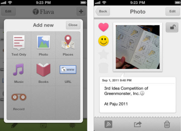 บันทึกช่วงเวลาทั้งหมดของคุณได้อย่างง่ายดายด้วยความสนุกสนานใน Flava แอพพลิเคชั่นที่ทำหน้าที่เปรียบเสมือนไดอารี่ในแบบดิจิตอล ซึ่งสามารถบันทึกได้ทั้งข้อความ memo , รูปภาพแสนประทับใจ , เพลง , พิกัดสถานที่ , คลิปเสียงต่างๆ หรือแม้กระทั่งลิงค์จากเว็บไซต์ที่ชื่นชอบ ตามวันที่และช่วงเวลาต่างๆในช่วงแต่ละวันได้อย่างง่ายดาย โดยฟังก์ชันการทำงานของ Flava ยังสามารถทำการส่งข้อมูลเพื่อแชร์ไปยัง email และ Social Network ชื่อดังต่างๆได้ไม่ว่าจะเป็น Facebook , Twitter และยังสามารถรองรับการ backup ข้อมูลผ่านทาง Dropbox และ Evernote ได้อีกด้วย เรียกได้ว่า Flava เป็นอีกหนึ่งแอพพลิเคชั่นที่มีประโยชน์และเหมาะสำหรับคนที่ชื่นชอบการจดบันทึกเป็นอย่างมาก หรือหากคุณเป็นคนที่ไม่เคยจดบันทึกมาก่อน Flava อาจทำให้คุณชื่นชอบการจดบันทึกไดอารี่ไปเลยก็เป็นได้