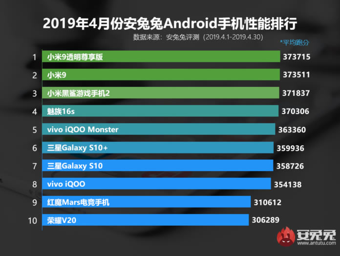 แอพพลิเคชั่นวัดประสิทธิภาพ AnTuTu รายงาน 10 อันดับสมาร์ทโฟนที่มีประสิทธิภาพสูงที่สุดในเดือนเมษายนที่ผ่านมา โดยรวบรวมข้อมูลเฉพาะสมาร์ทโฟนในประเทศจีน ที่ได้รับการทดสอบด้วย AnTuTu ในระหว่างวันที่ 1 – 30 เมษายน 2019 และสมาร์ทโฟนในแต่ละรุ่นที่ถูกบันทึกข้อมูล มีการทดสอบไม่น้อยกว่า 100 เครื่อง