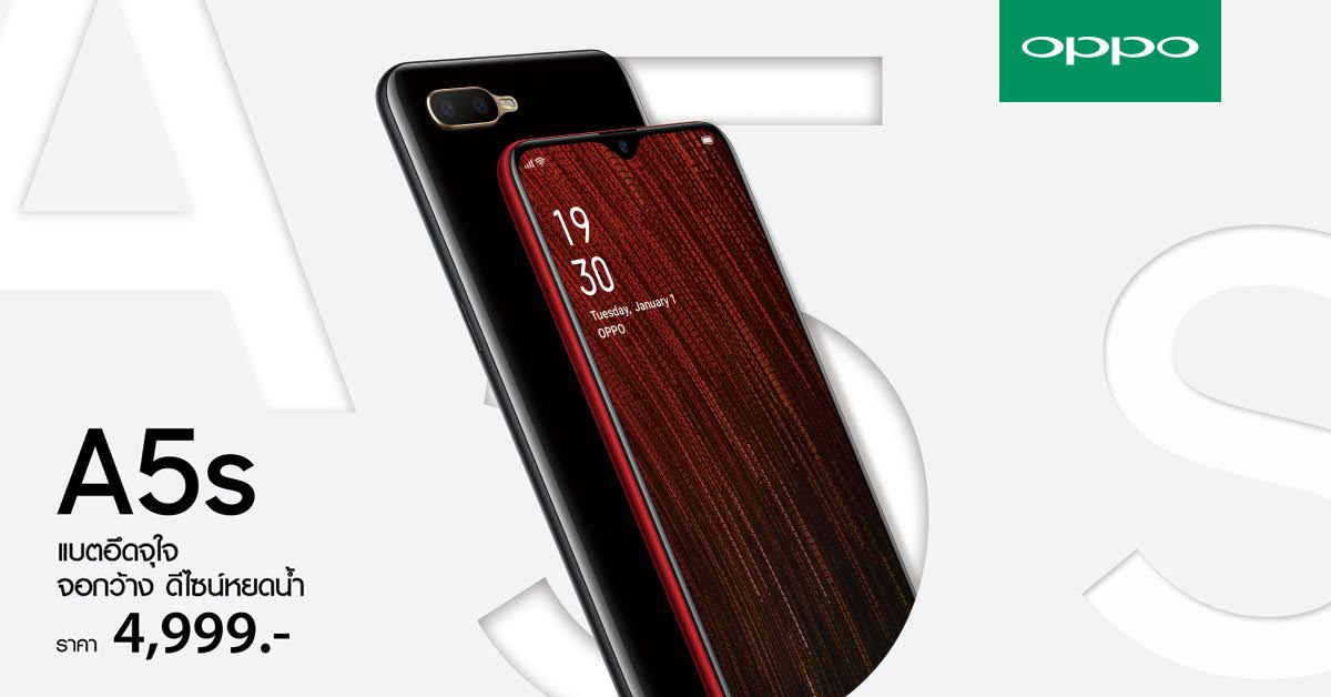 OPPO ได้เปิดตัวสมาร์ทโฟนน้องเล็ก รุ่นล่าสุด OPPO A5s ที่มีการออกแบบได้อย่างทันสมัย และแบตเตอรี่ที่สามารถใช้งานได้อย่างยาวนาน พร้อมหน้าจอดีไซน์หยดน้ำที่นับว่ามาแรงเป็นพิเศษนอกจากนี้ ยังมีกล้องหลังคู่และระบบสแกนลายนิ้วมือ พร้อมกับแบตเตอรี่ที่มีความจุถึง 4230 mAh ซึ่งOPPO A5s มีการเพิ่มประสิทธิภาพจาก AI algorithm ในการลดการใช้พลังงานจึงทำให้ใช้งานได้ยาวนานเป็นพิเศษ