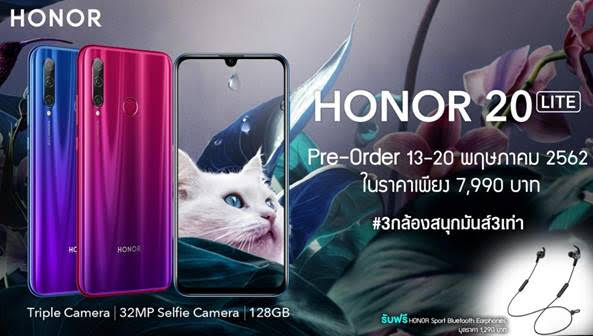 - สั่งซื้อ HONOR 20 Lite ล่วงหน้า ที่ AIS Online Store (http://m.ais.co.th/YyHKzyEfE) ในราคาพิเศษเพียง 3,990 บาท จากราคาปกติ 7,990 บาท รับฟรีทันทีHONOR Sport Bluetooth Earphones มูลค่า 1,290 บาท