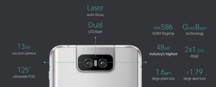 Asus เปิดตัวสมาร์ทโฟน Zenfone 6 (ZS630KL) อย่างทางการแล้ว โดยมีจุดเด่นที่ระบบกล้องหมุนได้ เป็นได้ทั้งกล้องหลังและกล้องเซลฟี่ โดยกล้องตัวหลักมีความละเอียด 48 ล้านพิกเซล (Sony IMX586) กล้องรอง 13 ล้านพิกเซล สำหรับถ่ายภาพมุมกว้างพิเศษ 125 องศา