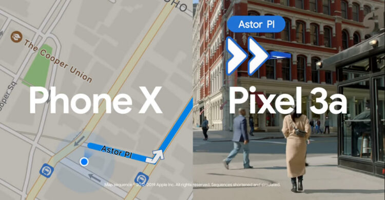สำหรับโฆษณาล่าสุดของ Pixel 3a นอกจากจะแสดงให้เห็นถึงวิธีการนำทางแบบ AR แล้ว ยังเปรียบเทียบกับระบบแผนที่ของ iPhone ด้วย ที่ยังแสดงผลในมุมมอง 2 มิติ ทั้งที่มีราคาแพงกว่า