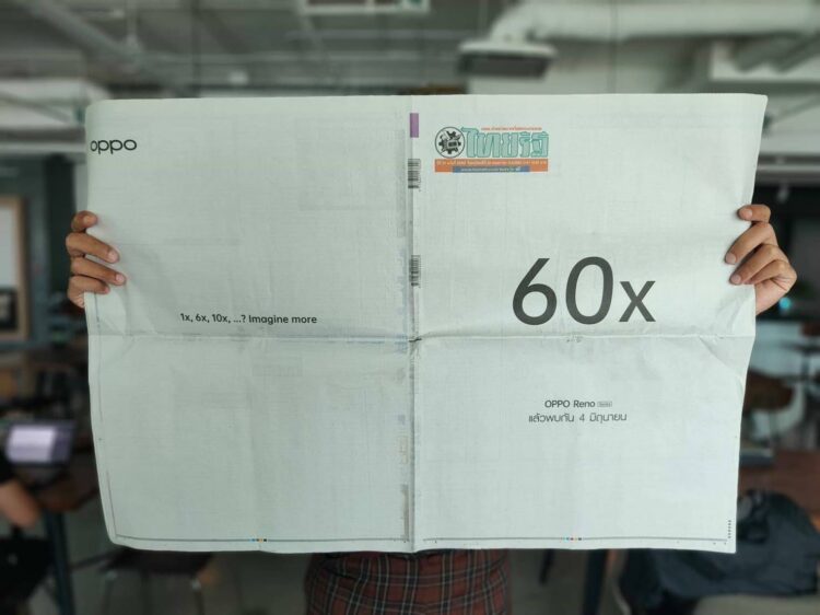 และวันนี้ OPPO ก็ได้สร้างความตื่นตาตื่นใจให้แก่ทุกคนอีกครั้ง ด้วยการปล่อยทีเซอร์ซูม 60x บนหน้าหนังสือพิมพ์ไทยรัฐ แบบจัดเต็ม!ทั้งด้านหน้าและด้านหลัง พร้อมกับประโยค “1x, 6x, 10x, …? Imagine more” ซึ่งเดาได้เลยว่า OPPO Reno นี้อาจมาพร้อมเทคโนโลยีซูมที่สามารถซูมได้ถึง 60 เท่า! ซึ่งเป็นที่น่าจับตามองกับงานเปิดตัววันที่ 4 มิถุนายนที่จะถึงนี้ โดยเป็นครั้งแรกที่จะให้ผู้เข้าร่วมงานสามารถลอง OPPO Reno 10x Zoom นี้ได้ ก็มาดูกันต่อไปว่าเทคโนโลยีซูมที่สามารถซูมได้ถึง 60 เท่านี้จะปังมากน้อยแค่ไหน