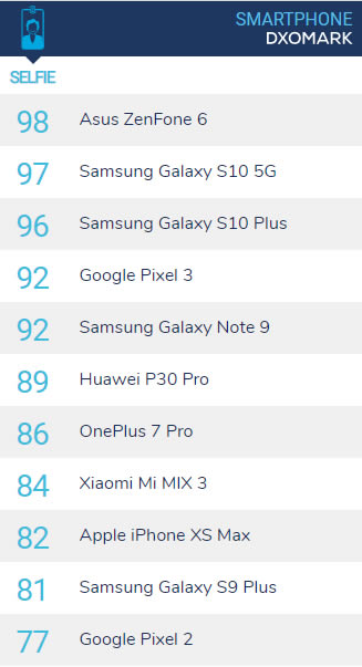 ที่น่าสนใจก็คือ Asus Zenfone 6 ใช้กล้องที่สามารถพลิกหมุนได้ เป็นได้ทั้งกล้องหลังและกล้องหน้า แต่ DxOMark เลือกที่จะมอบคะแนนสำหรับกล้องหน้า ทำให้ Zenfone 6 มีคะแนนสูงที่สุดในหมวดกล้องเซลฟี่ คือ 98 คะแนน แต่ถ้านำไปเทียบกับคะแนนกล้องด้านหลังของคู่แข่ง จะอยู่ในระดับเดียวกับ Google Pixel 2 และ OnePlus 6T