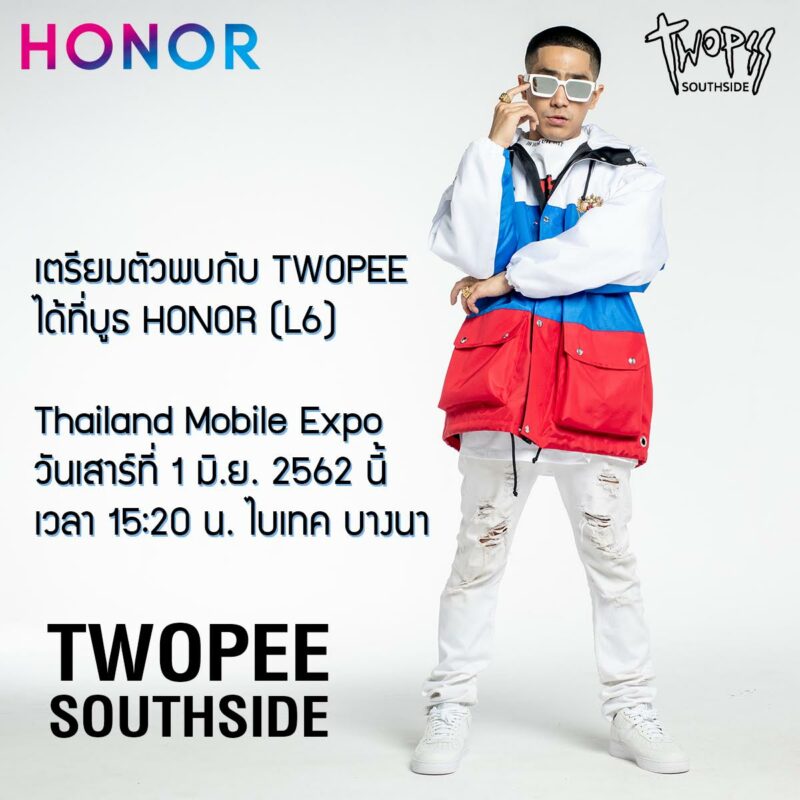 **ไฮไลท์สุดพิเศษพบกับ ‘โต้ง Twopee’ ที่จะมาโชว์ลีลาแร็ปสุดเท่ในวันเสาร์ที่ 1 มิถุนายน 2562 ตั้งแต่ 15.20– 16.20 น. ณ บูธออเนอร์ L6 กิจกรรมสุดพิเศษเฉพาะลูกค้าออเนอร์ 5 ท่าน!! มีสิทธิ์ร่วมชมมินิคอนเสริต์อย่างใกล้ชิดและรับของรางวัล Honor Sport Bluetooth Earphonesมูลค่า 1,290 บาท เพียงแสดงใบเสร็จหลักฐานการซื้อสมาร์ทโฟนออเนอร์รุ่นใดก็ได้ จำกัดการลุ้นรับสิทธิ์ 1 ท่าน ต่อ 1 เครื่อง ภายในงานThailand Mobile Expo 2019 ตั้งแต่วันที่ 30 พฤษภาคม – 1 มิถุนายน 2562 (หมดเขตลงทะเบียนเวลา 13.00 น.) และนำใบเสร็จมาลงทะเบียนที่บูธออเนอร์ L6 โดยออเนอร์จะสุ่มเลือกและประกาศรายชื่อผู้มีสิทธิ์ 5 ท่าน ในวันที่ 1 มิถุนายน2562 เวลา 13.20 น.ที่บูธออเนอร์ และ Facebook HONOR Thailandwww.facebook.com/HonorThai/ พิเศษแบบนี้เรียกได้ว่าสายแร็ปเปอร์หรือใครที่ชื่นชอบเพลงฮิปฮอปห้ามพลาด!