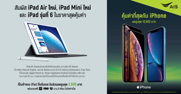 AIS มอบข้อเสนอสุดพิเศษสำหรับสาวก iPhone และ iPad ภายในงานมหกรรมโทรศัพท์มือถือ Thailand Mobile Expo 2019 ด้วยส่วนลด iPhone XS หรือ XS Max ลดสูงสุด 9,700 บาท iPhone XR ลดสูงสุด 9,200 บาท iPhone X ลดสูงสุด 6,500 บาท iPhone 8 Plus และ iPhone 8 ลดสูงสุด 13,500 บาท เมื่อซื้อพร้อมสมัครแพ็กกเกจ ตามเงื่อนไขที่บริษัทฯ กำหนด พร้อมกันนี้ AIS ยังนำ iPad รุ่นใหม่ล่าสุด อย่าง iPad Air และ iPad mini มาจัดโปรโมชั่นด้วย