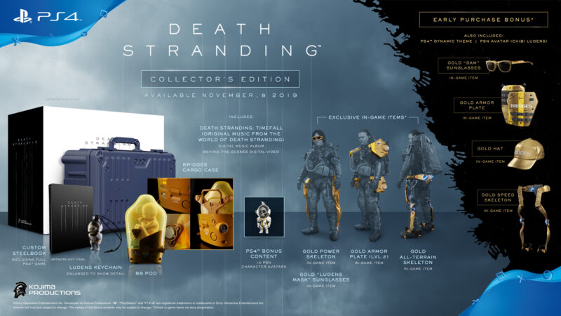 EATH STRANDING Collector’s Edition ประกอบด้วยเกมรูปแบบ Digital Deluxe Edition พร้อมด้วยโบนัสพิเศษสำหรับผู้ที่สั่งซื้อรูปแบบเออร์ลี เพอร์เชส (Early Purchase) รวมไปถึง:
