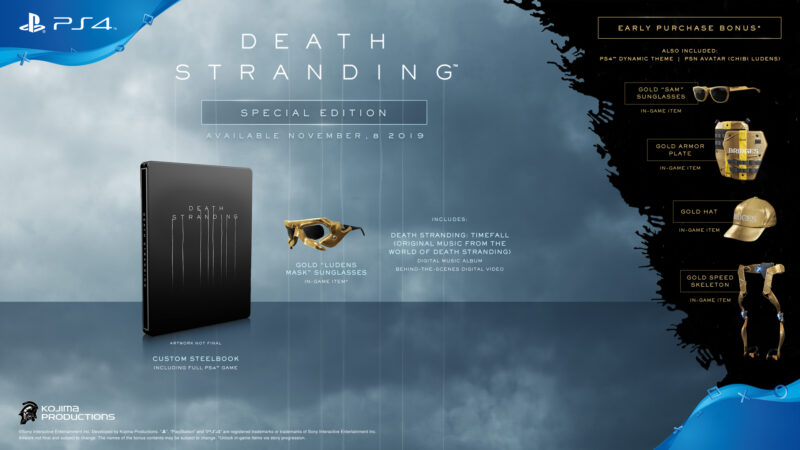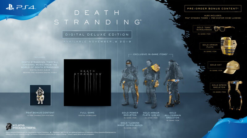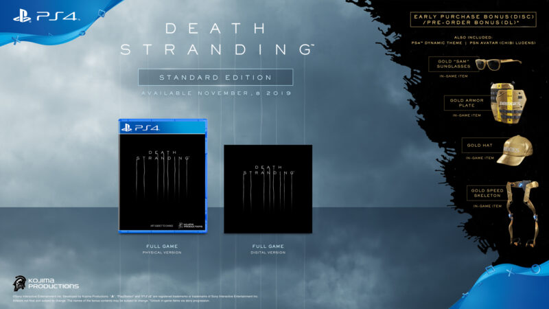 ผู้สนใจสามารถพรีออเดอร์ (Pre-Order) เกม DEATH STRANDING ในรูปแบบดิจิทัลดาวน์โหลดได้แล้ววันนี้ มีให้เลือกสองรูปแบบระหว่าง Standard Edition และ Digital Deluxe Edition โดยจะได้รับตัวเกมเต็ม และโบนัสพิเศษสำหรับผู้ที่สั่งซื้อในรูปแบบเออร์ลี เพอร์เชส (Early Purchase) รายละเอียดเพิ่มเติมสำหรับรุ่น Special Edition และ Collector’s Edition จะแจ้งให้ทราบในภายหลัง รวมไปถึงโบนัสพิเศษสำหรับผู้ที่สั่งซื้อในรูปแบบเออร์ลี เพอร์เชส (Early Purchase)