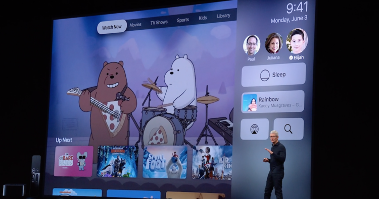 • การรองรับผู้ใช้หลายรายศูนย์ควบคุม Apple TV ใหม่ช่วยให้สลับระหว่างสมาชิกครอบครัวได้ง่าย เพื่อให้ทุกคนได้รับประสบการณ์ความบันเทิงในแบบที่ปรับมาให้เหมาะกับแต่ละคน ผู้ใช้จะเห็นรายการถัดไปในแบบของตนเองโดยเฉพาะ และรับคำแนะนำรายการทีวีและภาพยนตร์ตามความชอบส่วนตัว นอกจากนี้ศูนย์ควบคุมใหม่ยังให้ผู้ใช้สามารถเข้าใช้คุณสมบัติสำคัญๆ ของ Apple TV ได้อย่างรวดเร็ว รวมถึงการพักระบบและเส้นทางเดินของสัญญาณ