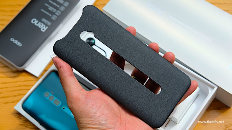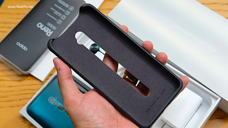 ในรุ่นนี้ OPPO แถมเคสคุณภาพดีมาให้ในกล่องด้วยเลย โดยจะมีการผ่าตรงกลางเป็นเส้นตรงตามแนวของตำแหน่งกล้องนั่นเอง ด้านในเป็นกำมะหยี่ ด้านล่างเขียนว่า Designed by OPPO