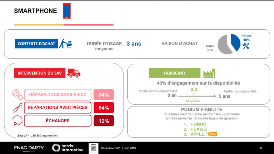 บริษัทวิจัย Harris Interactive ติดตามบริการหลังการของของ Darty ร้านจำหน่ายอุปกรณ์อิเล็กทรอนิกส์รายใหญ่ในยุโรป โดยรวบรวมรายชื่อแบรนด์สมาร์ทโฟนที่ถูกส่งเข้ามาซ่อมแซมภายใต้เงื่อนไขการรับประกันในช่วงเวลา 2 ปี