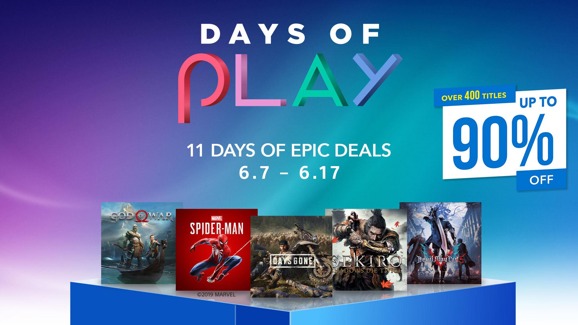 โปรโมชั่น DAYS OF PLAY บนช่องทาง PS Store จะเริ่มระหว่างวันที่ 7 – 17 มิถุนายน ศกนี้ คุณจะเพลิดเพลินไปกับเกมที่น่าสนใจบน PS Store มากกว่า 400 เกม และรับส่วนลดสูงสุดถึง 90% เช่นเกมขายดี Days Gone (ลด 34%), God of War (ลด 50%) และ Marvel’s Spider-Man (ลด 50%)