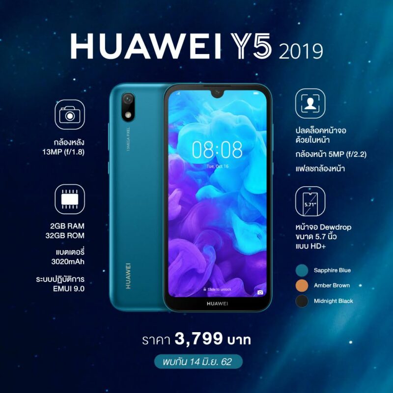 HUAWEI Y5 2019 วางจำหน่าย 14 มิถุนายนนี้ ราคา 3,799 บาทเท่านั้น พร้อมของแถมสุดพิเศษ HUAWEI Gift Box มูลค่า 990 บาท