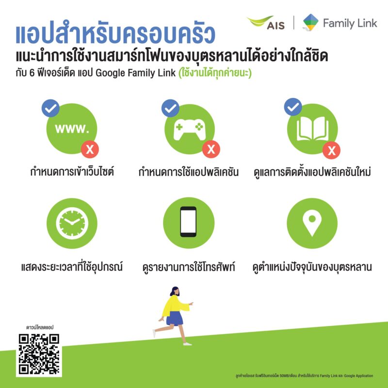 ร่วมมือกับ Google ในการนำบริการ Parental Control ผ่านแอปพลิเคชัน Google Family Link มาขยายผลสู่กลุ่มผู้ปกครองคนไทย (ใช้ได้ทุกเครือข่าย) ที่จะสามารถให้คำแนะนำ ดูแลการใช้งานโทรศัพท์ รวมถึงดูแลความปลอดภัยจากพิกัดปัจจุบันของบุตรหลานได้ง่ายๆ โดยเอไอเอส มอบอินเทอร์เน็ต on-top สำหรับการใช้งานให้ลูกค้าเอไอเอสสามารถดูแลบุตรหลานของท่านได้อย่างสบายใจ นายสมชัย เลิศสุทธิวงค์ ประธานเจ้าหน้าที่บริหาร เอไอเอส กล่าวว่า “ในฐานะ Digital Life Service Provider ที่มุ่งมั่นพัฒนา Digital Infrastructure เพื่อประเทศ นอกเหนือจากการทำหน้าที่พัฒนาบริการเพื่อตอบโจทย์ลูกค้าอย่างดีที่สุดแล้ว เรายังให้ความสำคัญกับการร่วมสร้างการเติบโตและพัฒนาสังคม สิ่งแวดล้อมอย่างสมดุลและยั่งยืน เพื่อทำให้ทุกภาคส่วน (Stakeholder) เติบโตได้อย่างแข็งแกร่ง