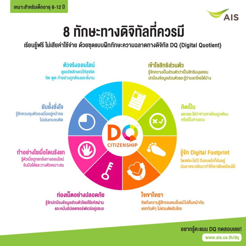 1. การยกระดับมาตรฐานความรู้เท่าทัน Digital ด้วย DQ (Digital Quotient)เอไอเอส โดยบทบาทการเป็นผู้ส่งเสริมการเรียนรู้ทักษะทางดิจิทัล (Digital Educator) เป็นรายแรกและรายเดียวในไทยที่ได้นำเข้า DQ ชุดการเรียนรู้ 360 องศา เพื่อพัฒนาทักษะและความฉลาดทางดิจิทัล DQ (Digital Quotient) ครบทั้ง 8 ทักษะ ให้กับเด็กๆ สร้างภูมิคุ้มกันในการก้าวเข้าสู่โลกออนไลน์อย่างมีไหวพริบ รู้จักวางตัวอย่างเหมาะสมกับคนแปลกหน้า และใช้มือถือ แท็บเล็ต อย่างฉลาด ไม่ส่งผลกระทบต่อสุขภาพ ซึ่งชุดการเรียนรู้นี้ได้รับการยอมรับและมีการนำไปฝึกทักษะให้กับเด็กๆ มากกว่า 110 ประเทศทั่วโลก แปลถึง 21 ภาษา จาก 100 พาร์ทเนอร์ ขณะนี้ ได้เริ่มขยายผลการสร้างทักษะความฉลาดทางดิจิทัล DQ (Digital Quotation) ไปสู่ภาคการศึกษาทั่วประเทศ รวมถึงเปิด Portal ศูนย์กลางการเรียนรู้สำหรับคนไทยทุกคน ที่โรงเรียน หรือ สถาบันที่ทำงานเพื่อพัฒนาเยาวชนต่างๆ สามารถเข้ามาใช้งานได้แล้ววันนี้ที่ www.ais.co.th/dq