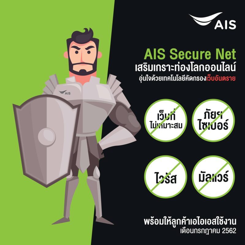 เปิดตัว AIS Secure Net (Beta) ที่จะช่วยป้องกันและคัดกรองเนื้อหาบนโลกออนไลน์ ไม่ว่าจะเป็นเว็บ, ข้อความ รูปภาพ หรือวิดีโอที่ไม่เหมาะสม จากบุตรหลาน ในช่วงแรกนี้ เอไอเอสจะเปิดให้ลูกค้าได้ทดลองใช้บริการเป็น Beta Phase เชิญชวนลูกค้าเอไอเอสที่สนใจอยากใช้บริการ เข้ามาลงทะเบียนผ่านหน้าเว็บไซต์ เพื่อร่วมเป็น Pioneer ในการทดลองใช้บริการก่อนใคร จำนวน 10,000 คนแรก สามารถเข้ามาลงทะเบียนได้ตั้งแต่วันที่ 25 มิถุนายน 2562 และลูกค้ากลุ่มนี้ ก็จะได้ทดลองใช้บริการ AIS Secure Net ได้ตั้งแต่วันที่ 4 กรกฎาคม 2562 เป็นต้นไป