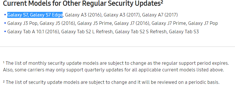 ล่าสุด Samsung Galaxy S7 และ Galaxy S7 Edge ได้ถูกลดระดับลงไปอยู่ในกลุ่มที่ 3 นั่นหมายถึง อดีตเรือธง 2 รุ่นนี้ จะไม่ได้รับการอัพเดทซอฟต์แวร์ด้านความปลอดภัยบ่อยครั้งเหมือนกับที่เคยเป็นมา จากปกติที่อาจได้รับทุกๆ 3 เดือน นับจากนี้จะต้องรอนานกว่านั้น
