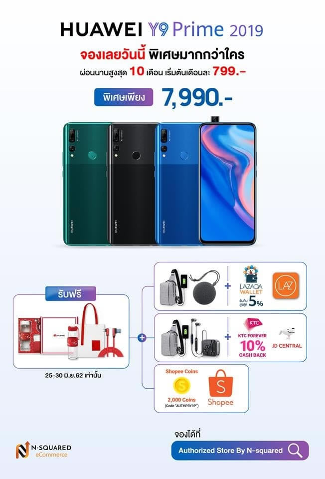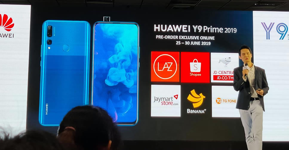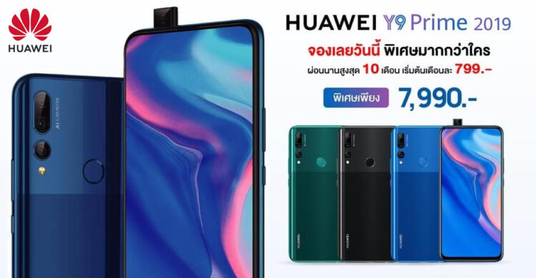 Huawei Y9 Prime 2019 จะเปิดรับจองแล้วตั้งแต่วันนี้ ไปจนถึงวันที่ 30 มิถุนายน ผ่านระบบออนไลน์ของ Lazada, Shopee, JD, Jaymart, Banana และ TG Fone ก่อนจะเริ่มวางจำหน่ายในวันที่ 5 กรกฎาคมนี้ ในราคาเพียง 7,990 บาท